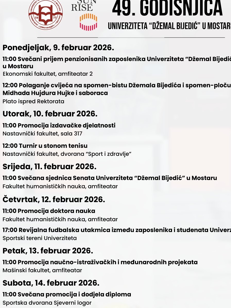 Univerzitet „Džemal Bijedić“ u Mostaru od 9. do 14. februara 2026. godine obilježit će 49. godišnjicu svog osnivanja, postojanja i rada, realizacijom sveobuhvatnog programa svečanih akademskih, naučnih, kulturnih i sportskih aktivnosti.