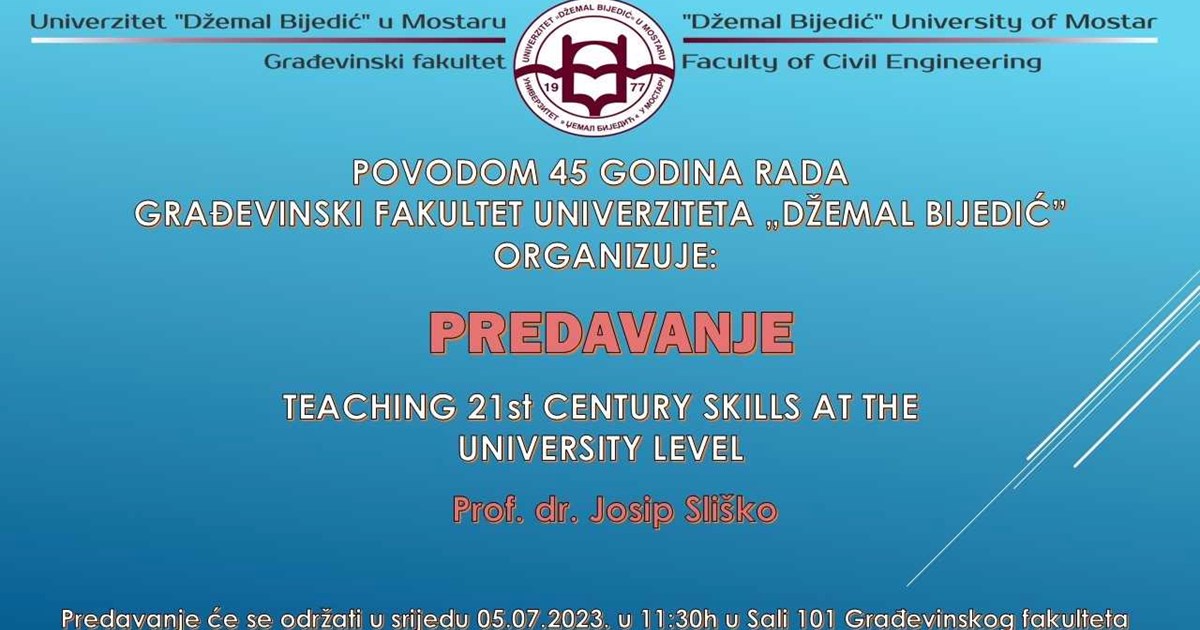 U sklopu obilježavanja 45. godišnjice Fakulteta, Građevinski fakultet organizuje predavanje na temu: “Teaching 21st century skills at the university level"