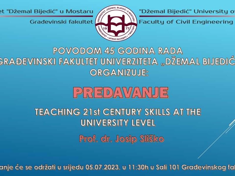 U sklopu obilježavanja 45. godišnjice Fakulteta, Građevinski fakultet organizuje predavanje na temu: “Teaching 21st century skills at the university level" koje će održati prof.dr. Josip Sliško, prijašnji član našeg kolektiva koji trenutno predaje na Benemérita Universidad Autónoma de Puebla u Meksiku.