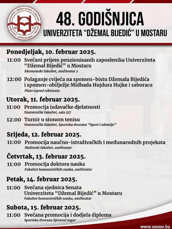 Program će početi 10. februara tradicionalnim prisjećanjem na historijske ličnosti i velikane, Džemala Bijedića po kojem Univerzitet nosi ime i Midhada Hujdura Hujku po kojem je nazvan univerzitetski sportsko-rekreacioni centar u kojem je smješten Univerzitet „Džemal Bijedić“ u Mostaru. Istog dana, menadžment Univerziteta upriličit će svečani prijem penzionisanih zaposlenika, te iskazati zahvalnost za dugogodišnji uspješan rad na Univerzitetu „Džemal Bijedić“ u Mostaru.